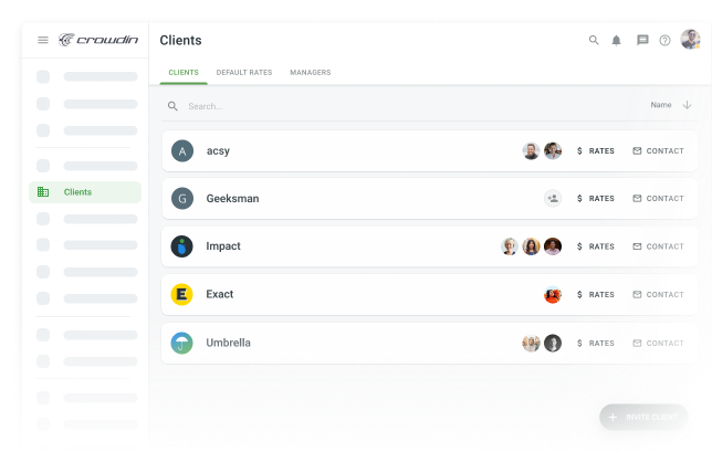 Спіс агенцтваў перакладу будзе ўключаць толькі вашу кампанію. Таксама даступна па запыце ў Crowdin Enterprise белая маркіроўка. Перакладайце запыты кліентаў з вашага боку, выкарыстоўваючы вашы канкрэтныя працоўныя працэсы, ПП і гласарыі без неабходнасці дзяліцца імі з кліентам.